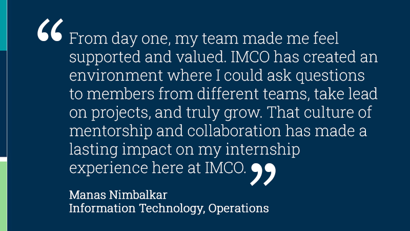 IMCO's student internship program is a 4-month paid opportunity running from May to August, designed to support your personal and professional growth.